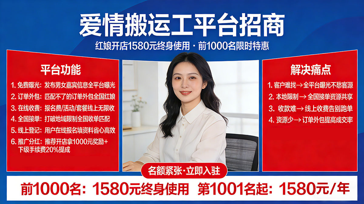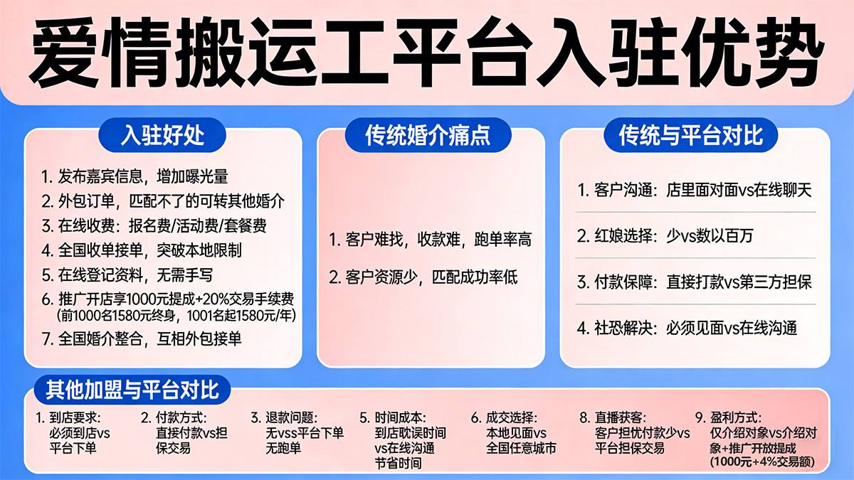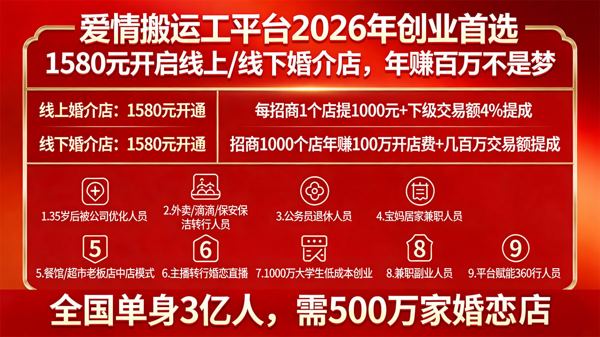 关于我们爱情搬运工婚介品牌,注册于2018年,由深圳市三亿链科技有限公司全权运营,是一家深耕婚恋社交领域、以科技赋能婚恋服务的创新型企业。我们始终坚守双重使命:以“用技术连接真爱”为核心,依托旗下“爱情搬运工”婚介核心平台,通过大数据精准匹配、AI智能推荐、严格实名认证体系,搭配生肖、星座匹配、婚姻登记状态核查、身份证核验、资产状态查询等全方位服务,让每一位用户在开启情感之旅前,都能全面、安全地了解对方,真正实现高效、安全、靠谱的婚恋对接;同时以“让天下没有难找的缘分,助力国家生育大计,成就个人美好婚姻”为初心,创新婚介运营模式,既破解当代单身群体的婚恋难题,也为创业者提供低门槛、高潜力的创业路径。品牌深耕行业多年,始终聚焦轻资产创业赋能,每年创造百万级轻资产创业机会,助力百万人实现创业就业梦想。我们打破传统婚介创业壁垒,让更多创业者无需高额投入,即可投身婚介网店行业,在帮助他人收获美满婚... MORE2017万盛石林相亲会正式启动 每周脱单仅需38元,-怎么赚