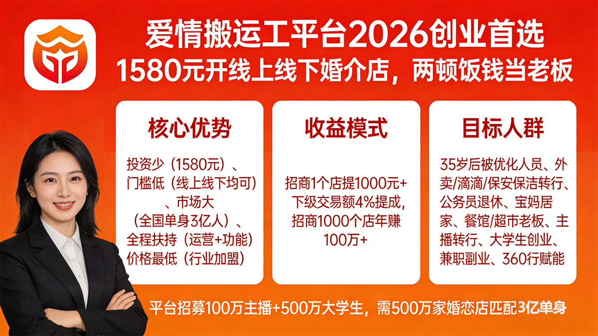 关于我们爱情搬运工婚介品牌,注册于2018年,由深圳市三亿链科技有限公司全权运营,是一家深耕婚恋社交领域、以科技赋能婚恋服务的创新型企业。我们始终坚守双重使命:以“用技术连接真爱”为核心,依托旗下“爱情搬运工”婚介核心平台,通过大数据精准匹配、AI智能推荐、严格实名认证体系,搭配生肖、星座匹配、婚姻登记状态核查、身份证核验、资产状态查询等全方位服务,让每一位用户在开启情感之旅前,都能全面、安全地了解对方,真正实现高效、安全、靠谱的婚恋对接;同时以“让天下没有难找的缘分,助力国家生育大计,成就个人美好婚姻”为初心,创新婚介运营模式,既破解当代单身群体的婚恋难题,也为创业者提供低门槛、高潜力的创业路径。品牌深耕行业多年,始终聚焦轻资产创业赋能,每年创造百万级轻资产创业机会,助力百万人实现创业就业梦想。我们打破传统婚介创业壁垒,让更多创业者无需高额投入,即可投身婚介网店行业,在帮助他人收获美满婚... MORE